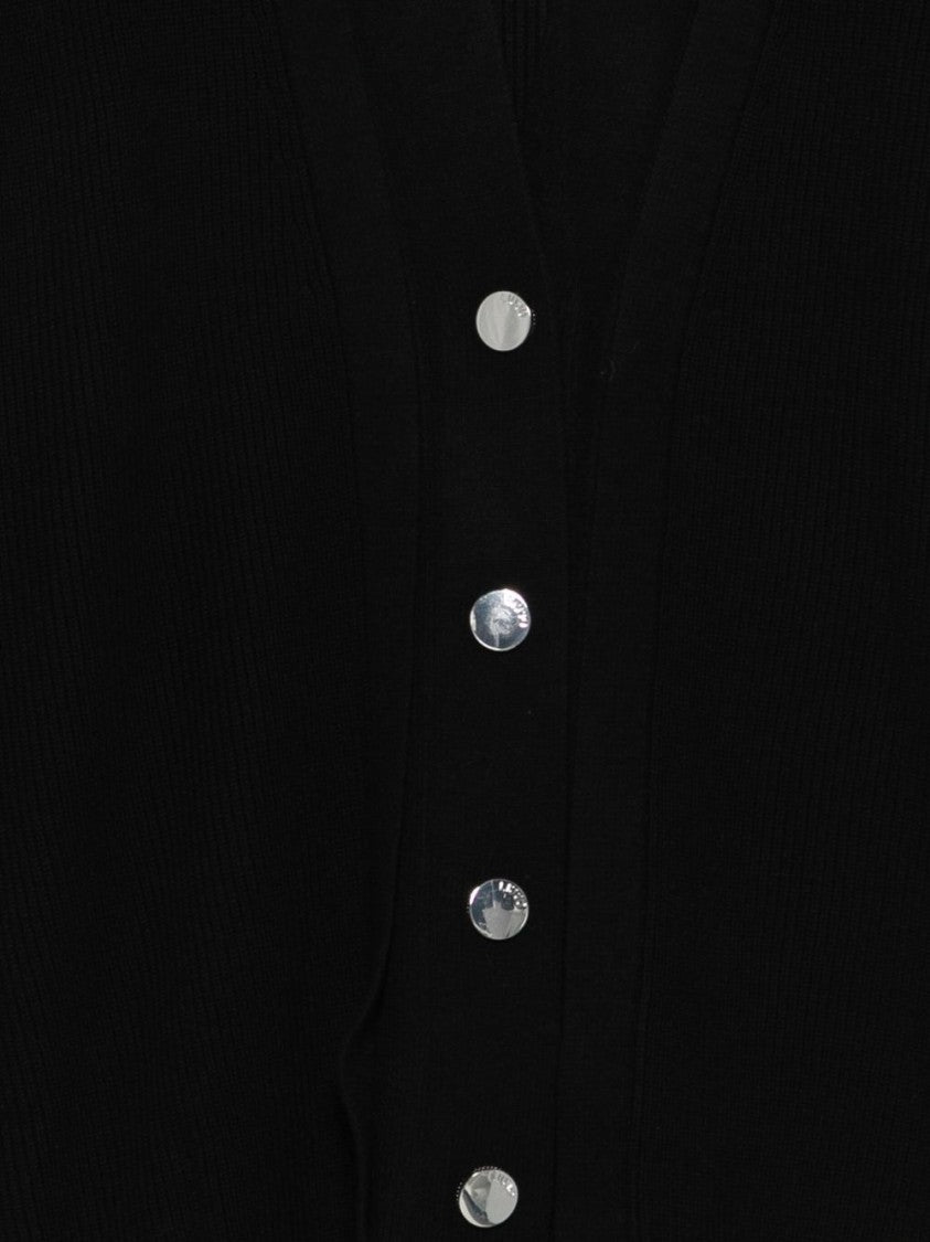 The Liu Jo Nero sweater combines comfort with a touch of elegance. The minimalist style includes a V-neckline and a button-down front adorned with shiny silver buttons. Made from a soft ribbed knit fabric, it has a relaxed fit, ideal for layering or wearing alone on different occasions.