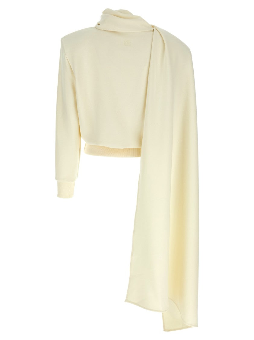 Crafted by Magda Butrym, this cropped sweatshirt features a luxurious viscose blend that ensures a soft and inviting touch. The standout design includes a crew neck with an attached scarf that drapes elegantly, allowing for versatile styling. With long sleeves and fitted cuffs, the minimalist silhouette speaks to contemporary design and effortless wearability, making it an essential piece for any wardrobe.
