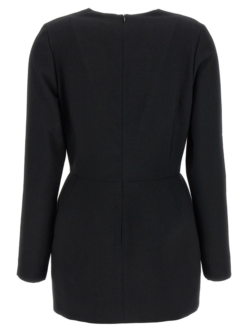 This mini dress by Magda Butrym showcases a beautiful combination of artistry and sophistication. The deep V-neck and eye-catching 3D floral application at the waist enhance the overall design, while the long sleeves and structured skirt contribute to a polished silhouette. Crafted from high-quality black wool and lined with silk, it promises comfort and elegance. A back zip closure adds practicality while maintaining a stylish look.