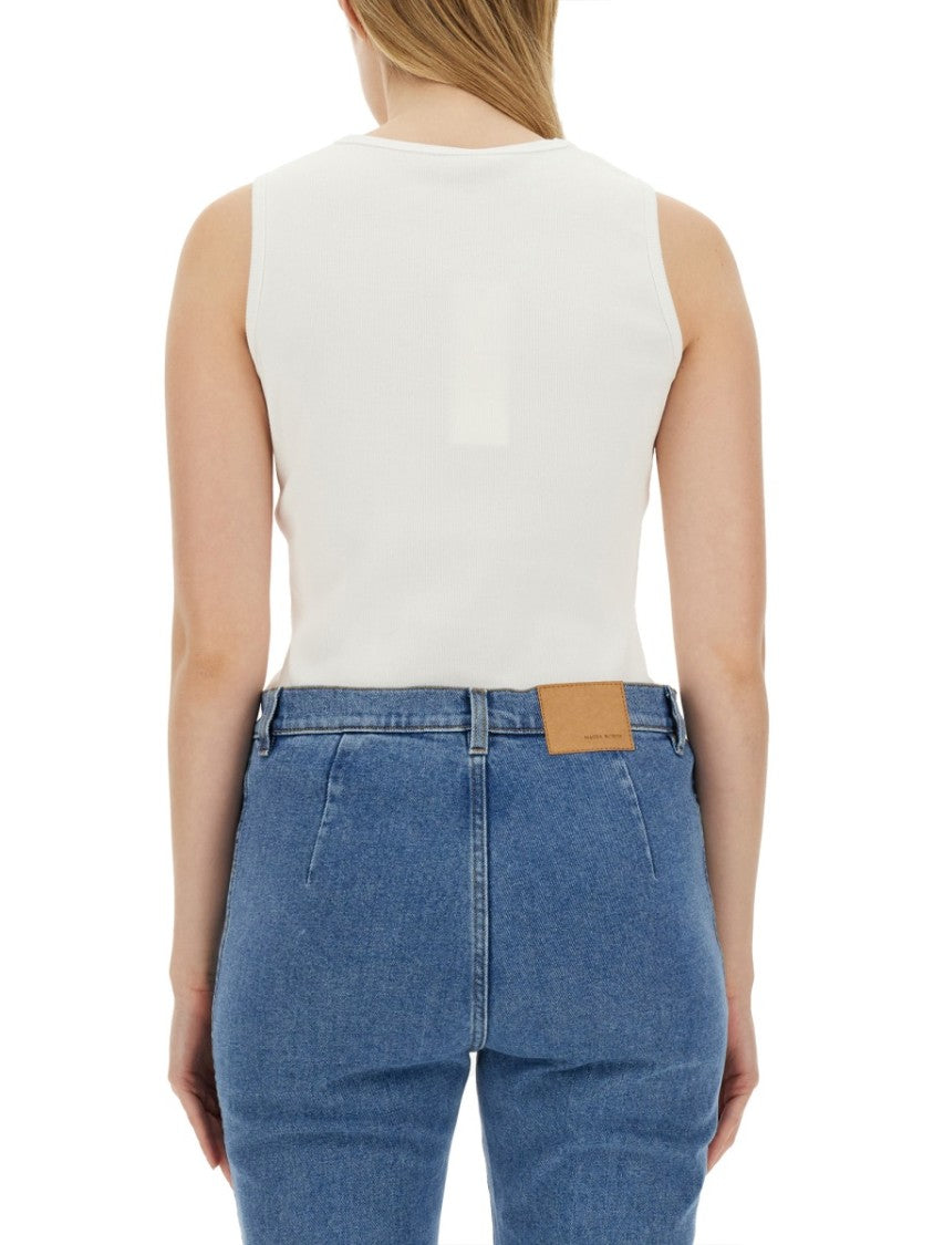 A fitted sleeveless top by Magda Butrym showcases a unique crochet design at the bust, expertly made from soft 100% cotton. It features a round neckline and a smooth texture, epitomizing comfort and contemporary style. Perfect for casual outings or chic gatherings, this versatile piece blends elegance and comfort.