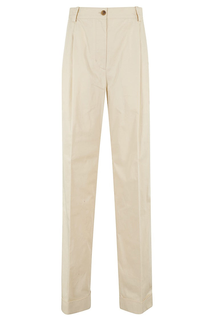 Elevate your wardrobe with the Maison Kitsune palazzo-style pants, meticulously crafted from 100% cotton. Designed with a high waistband, belt loops, and a sophisticated flap closure, these pants offer both style and functionality. Their tailored aesthetic is enhanced by front darts and an embroidered logo detail at the back, making them a symbol of modern elegance. Perfect for effortless day-to-night transitions.