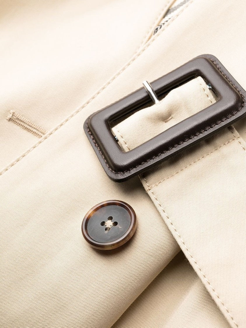This Maison Margiela long trench coat showcases timeless elegance through its classic beige textile fabric and structured silhouette. The design includes a belted waist with a rectangular buckle, button closures, and buttoned cuffs, ensuring a blend of style and functionality. Flap pockets and subtle stitched detailing further enhance its refined appeal.