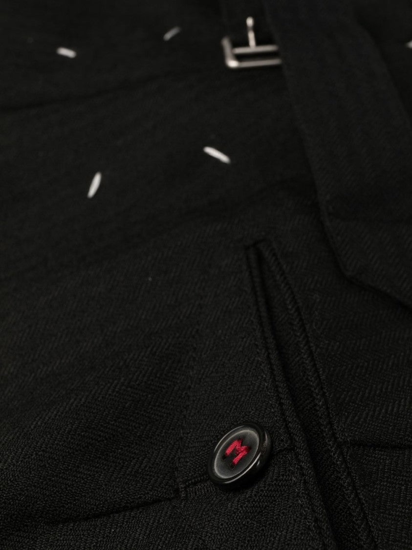 Tailored high-waist trousers from Maison Margiela showcase modern sophistication. The straight leg design and subtle textured fabric are complemented by front pleats, adding a refined touch. A classic button closure and belt loops enhance versatility, suitable for casual and formal occasions.
