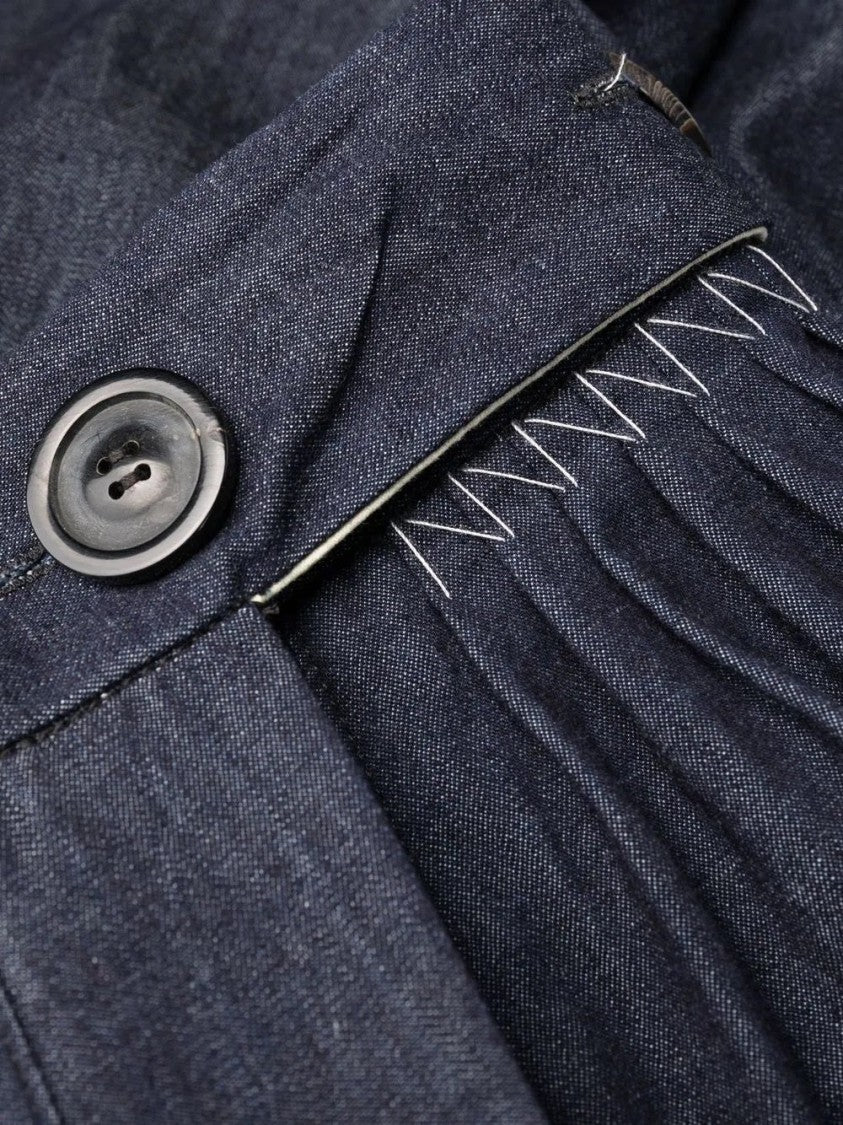 Experience the impeccable craftsmanship of Maison Margiela wide-leg trousers made from dark blue cotton. The high waist includes striking button details and pleated accents, offering a blend of structure and elegance for the modern woman.