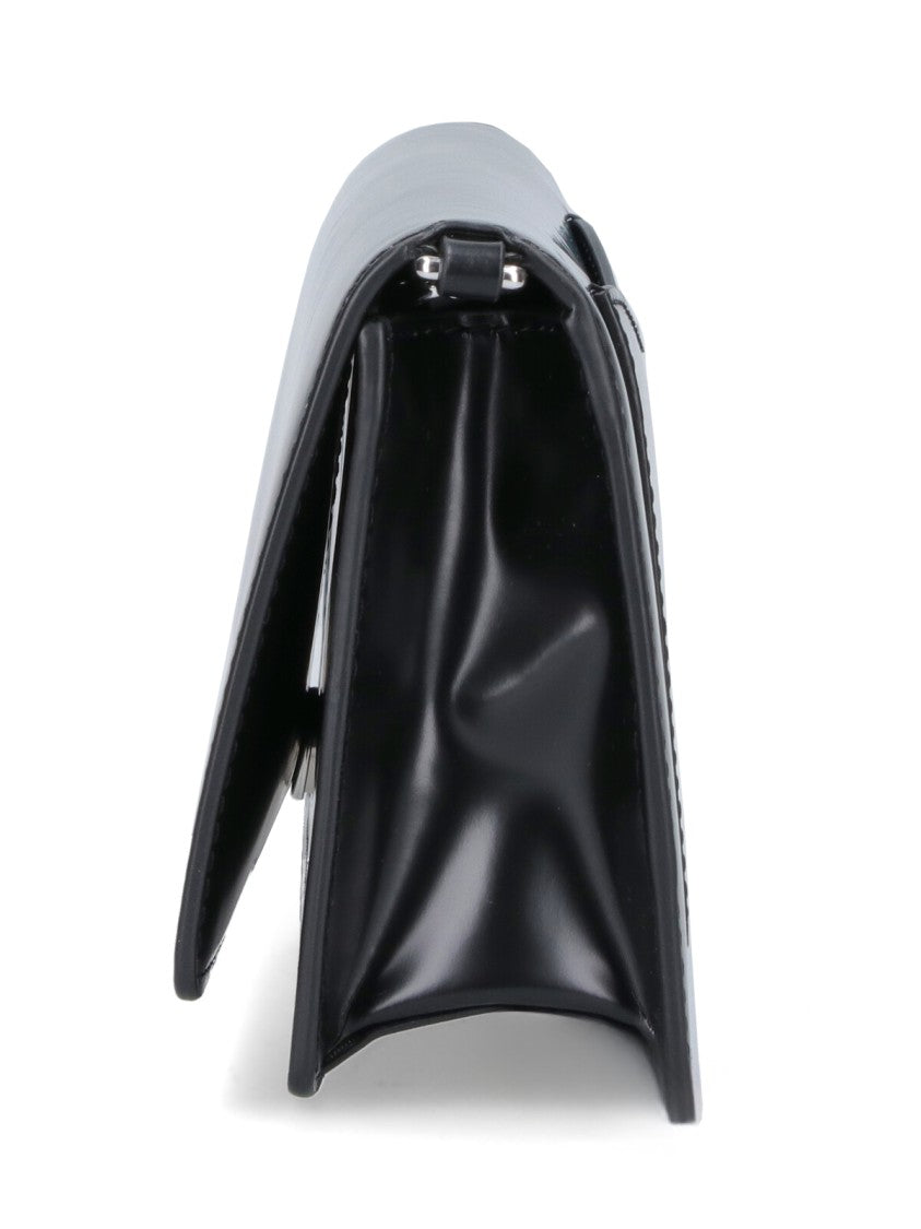 Marc Jacobs presents this sophisticated rectangular black bag, radiating modernity with its glossy finish and streamlined silhouette. The flap closure is adorned with a subtle metallic logo, while the detachable wrist strap offers versatility for various occasions. The smooth interior features a secure snap button fastening and a unique decorative cutout detail, blending functionality with refined aesthetics.