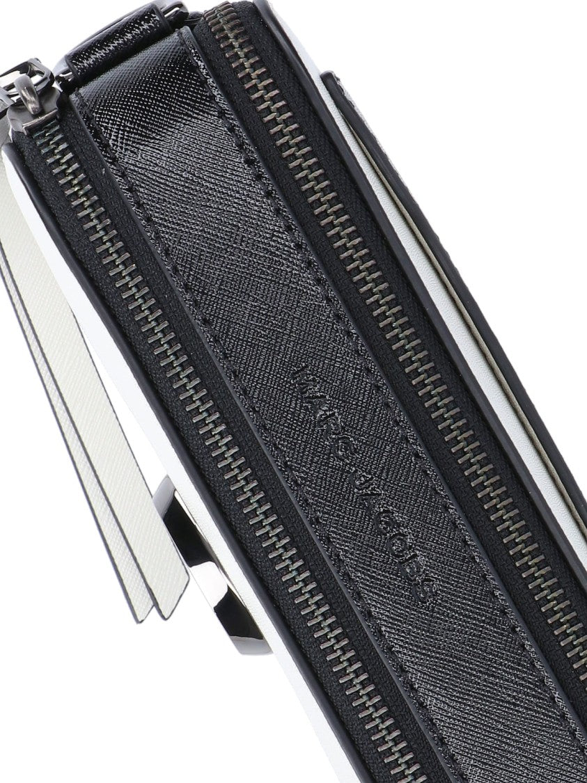 This crossbody bag by Marc Jacobs features a stylish combination of white leather and black accents, highlighted by an embossed logo on the front. The bag is designed with a double zip closure and a removable adjustable strap that showcases a signature logo pattern. Inside, it offers an organized layout with a main compartment and flat pockets for easy access to essentials.