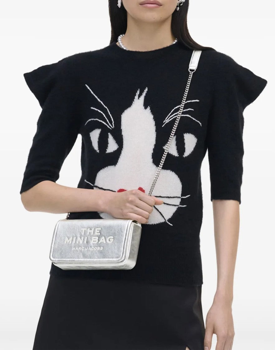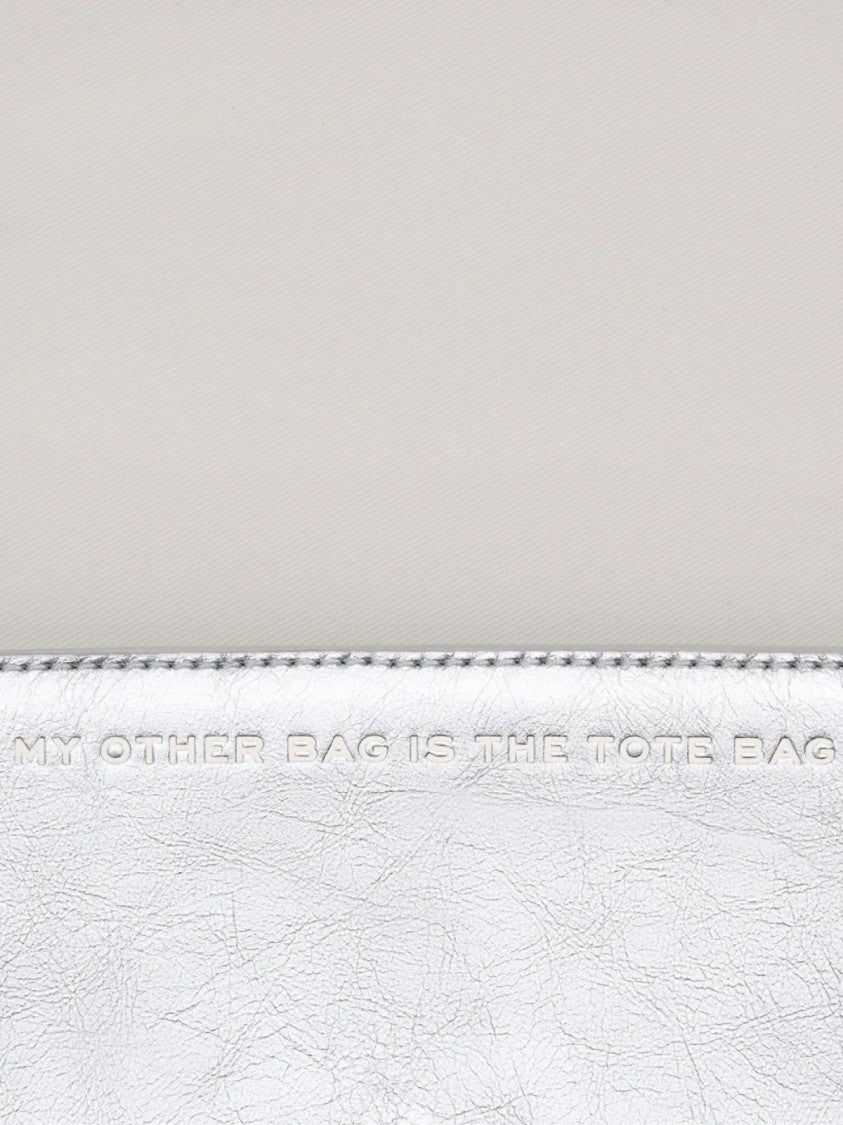 A sleek mini shoulder bag crafted from metallic leather, showcasing a radiant silver finish. The design features a rectangular silhouette and a flap closure elegantly embossed with bold branding. Functionality meets style with a silver chain strap, complemented by a leather shoulder pad for enhanced comfort. The interior is tailored for convenience, including card slots for effortless organization.