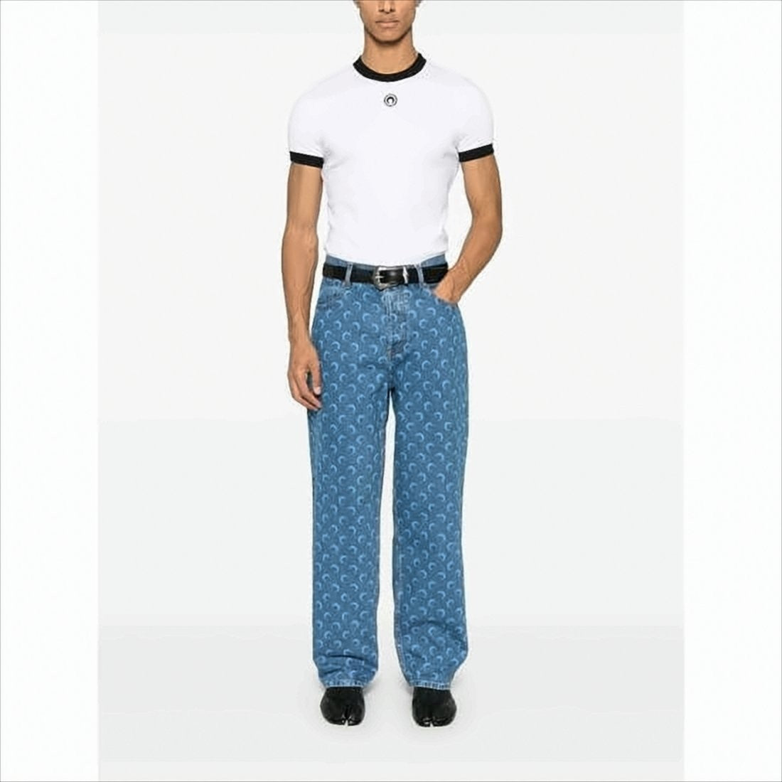 Marine Serre presents a refined short-sleeve t-shirt crafted from 100% organic cotton. The design showcases a pristine white foundation accentuated with sophisticated black ribbed trims on the collar and sleeve cuffs. A small circular emblem graces the chest, while a rectangular label sits at the upper back, adding a subtle touch of branding to this slim, tailored fit.