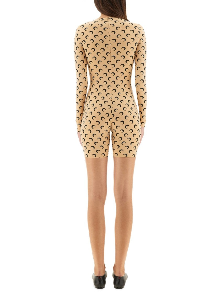 This striking slim-fit jumpsuit from Marine Serre is crafted from a smooth, stretchy blend of premium polyamide and elastane, ensuring a flattering silhouette. The design features an enchanting crescent moon pattern that adds a touch of whimsy, while the long sleeves and short legs provide a unique contrast. An embodiment of modern artistry, this piece is ideal for those who embrace bold yet refined fashion.