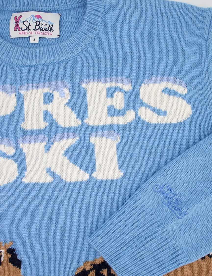 This MC2 Saint Barth knit sweater captures the essence of winter with its light blue canvas and festive mountain and ski motifs in white, brown, black, and green. The regular fit provides comfort, complemented by ribbed hem, cuffs, and neckline for added coziness. Playful bold white text enhances its seasonal charm.