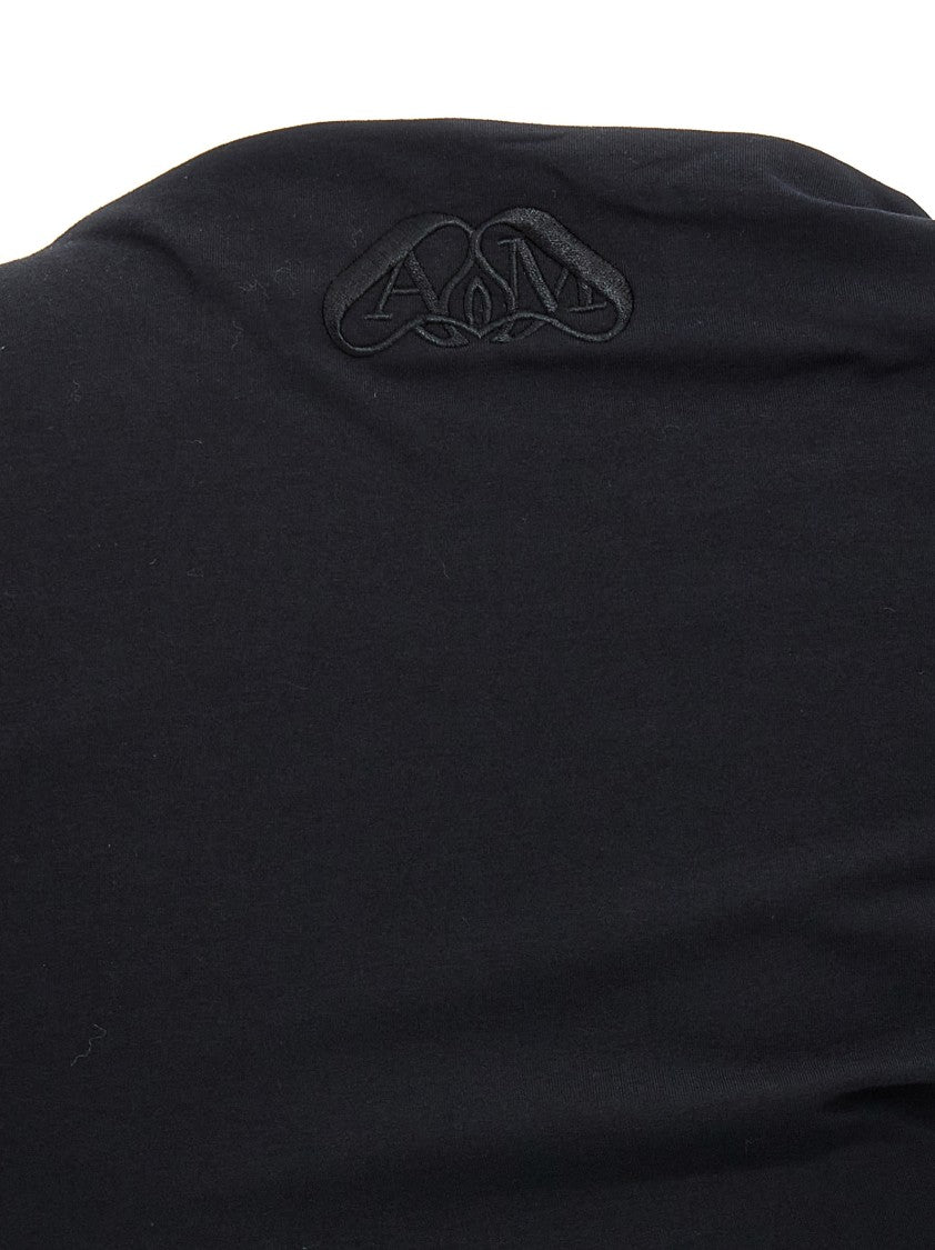 Contemporary asymmetrical stretch cotton top by McQueen with a unique design and striking knot detail on one shoulder. Soft and flexible fabric provides a flattering silhouette that gently hugs the body, ensuring comfort and style for modern occasions.