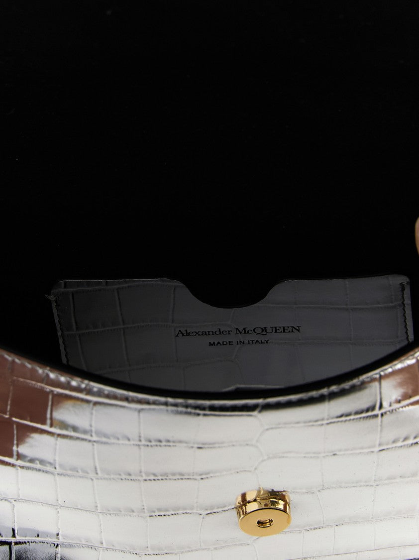 This small crossbody bag by McQueen embodies refined craftsmanship and bold design. Premium metallic calf leather showcases a glossy finish and a distinctive crocodile-effect embossed texture. A magnetic flap features a striking gold-tone skull detail, adding an avant-garde touch. The antiqued gold and silver chain shoulder strap enhances its luxurious appeal. Ideal for the modern connoisseur, this bag complements any ensemble, making a statement wherever it goes.