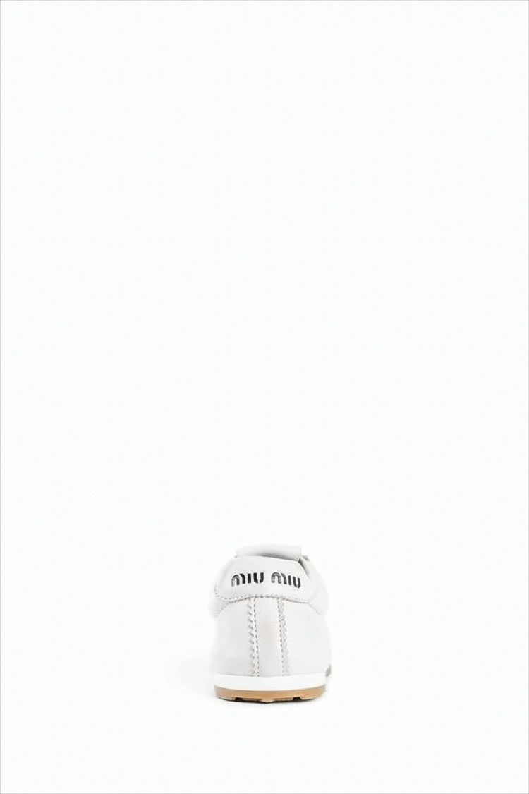 A refined pair of low-profile sneakers by Miu Miu, expertly crafted from smooth nappa leather. The minimalist design features subtle stitching details, a rounded toe, and a lace-up front, complemented by a rubber outsole with a natural tan finish for added contrast and grip. A discreet logo adorns the back heel tab, embodying the epitome of sophistication and casual elegance.