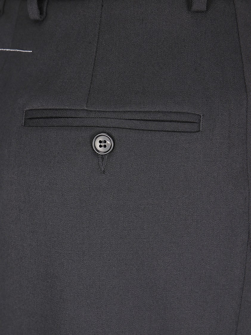 High-waisted midi skirt from MM6 By Maison Margiela, showcasing a sophisticated straight silhouette. Crafted from a premium blend of wool and polyester, it features a refined, smooth texture. The side zipper closure enhances practicality while maintaining a symmetrical design, complemented by belt loops and two buttoned welt pockets at the back. This piece is the epitome of minimalist chic, perfect for versatile styling, day or night.