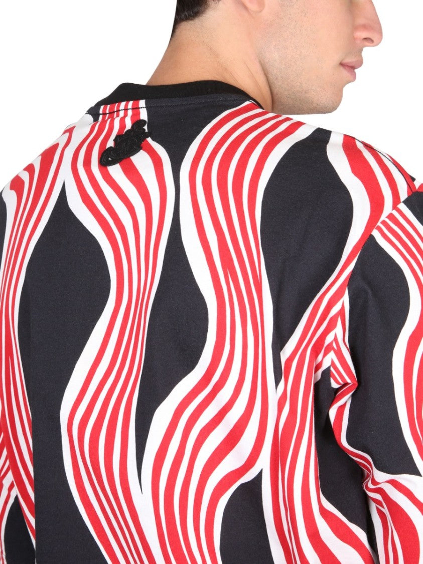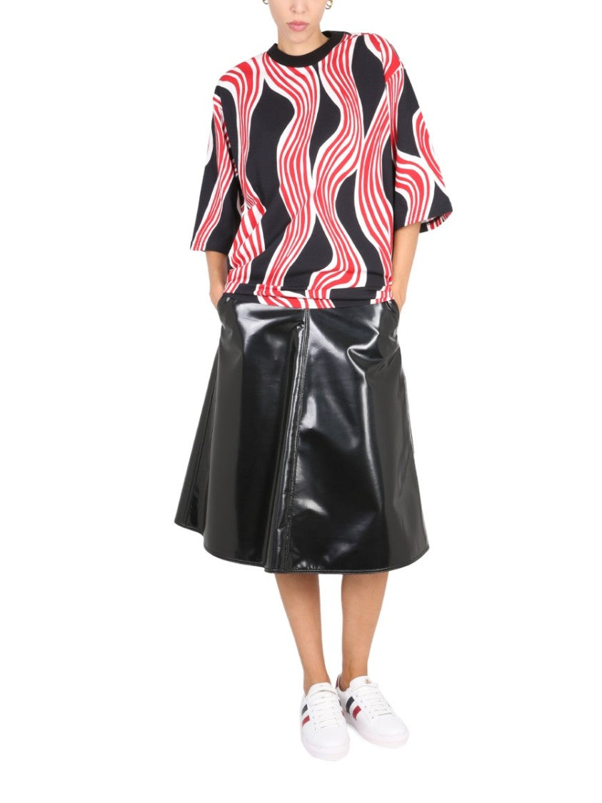 This graphic T-shirt from Moncler Genius showcases a striking wavy crossbar pattern in red and white against a rich black background. Designed for both men and women, it features a relaxed fit, round neckline, and an embroidered logo detail on the upper back, making it an essential addition to any contemporary wardrobe.
