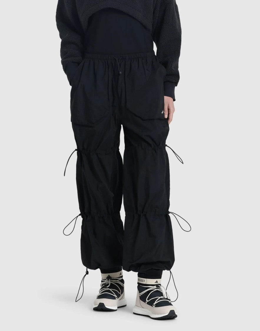 The Moonboost High Boots showcase a striking blend of textile and rubber, highlighted by a rich Core Black upper and a contrasting light-hued sole. Style and comfort are prioritized, complemented by a lace-up closure and a distinctive branded strap for added support.