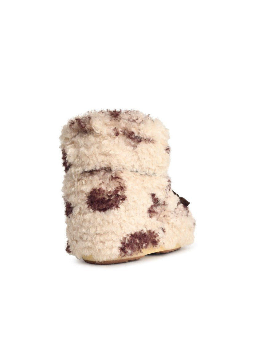 These Moon Boot faux fur boots combine playful elegance with a captivating cow print pattern. Crafted from premium curly-effect synthetic fibers, they feature dark laces that enhance the bold aesthetic. The plush and voluminous silhouette ensures both warmth and comfort.