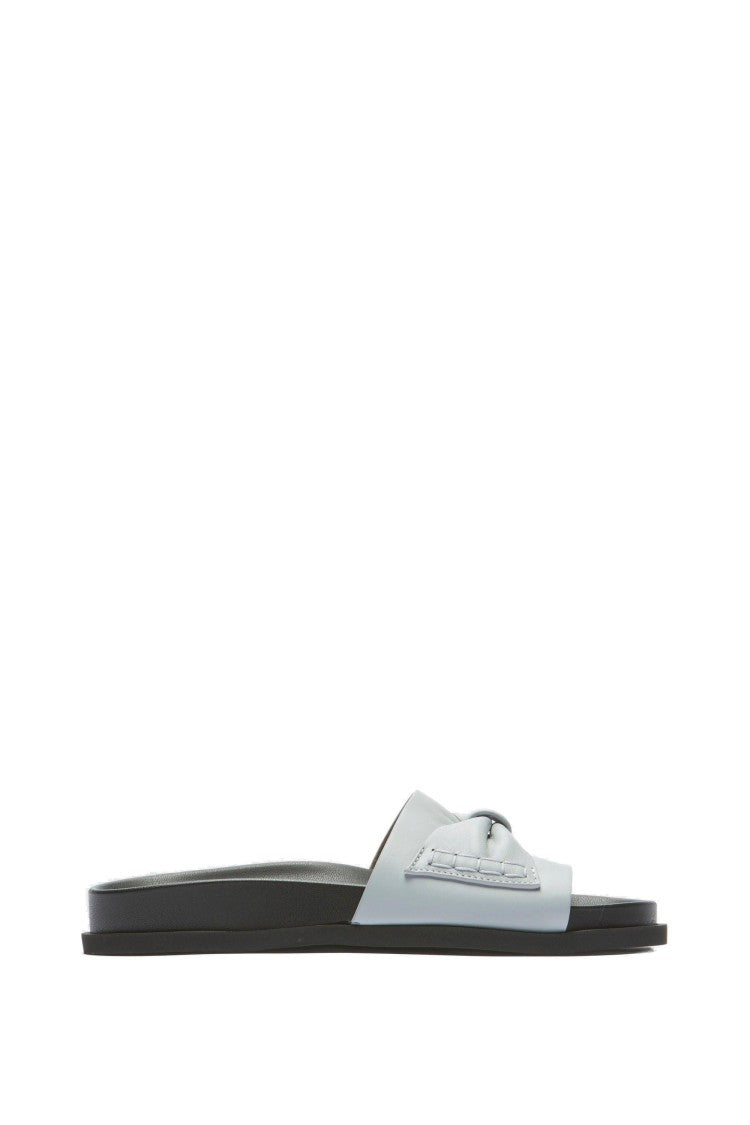 These grey leather fussbett sandals showcase a charming bow detail at the front. Their simple design is paired with a comfortable flat sole, making them perfect for casual outings.