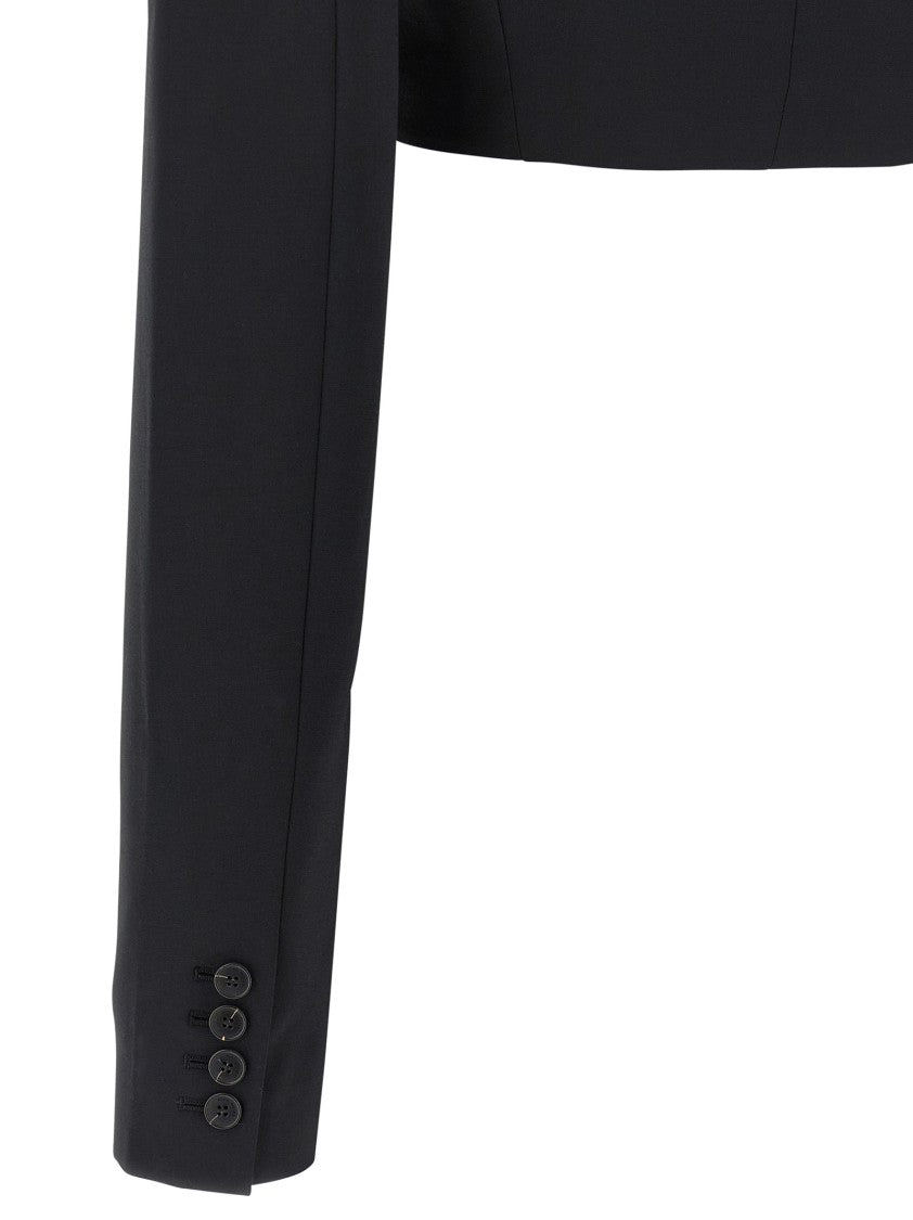 Nensi Dojaka'S 'Cleo' Bolero Crop Blazer Stands Out With Its Bold Design, Featuring Maxi Padded Shoulders And A Wide Square Neckline. Crafted From A Luxurious Wool Blend, It Offers A Tailored Fit That Flatters The Silhouette. The Blazer Is Completed With A Front Button Closure And Long Sleeves, Embodying Confidence And Contemporary Style For The Modern Woman.