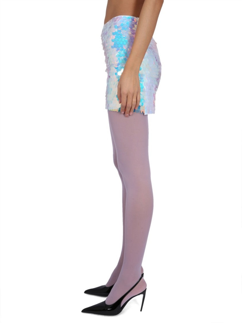 Nina Ricci's shimmering sequin mini skirt features a stunning design that captures light with every movement, ensuring a captivating presence. Its sleek silhouette is complemented by a practical side zipper closure, making it stylish and easy to wear for various occasions.