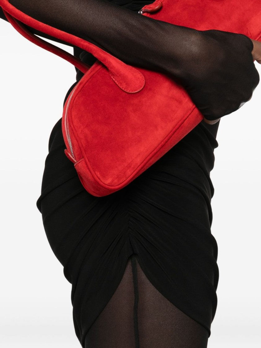 Norma Kamali offers a striking black mini dress that artfully combines comfort and sophisticated design. The fitted silhouette showcases elegant ruched detailing on the skirt, complemented by a sheer mesh high neckline and long sleeves that create a beautiful layered effect over a sleek strapless bodice. An asymmetrical hemline introduces a contemporary flair, making this dress suitable for various occasions.