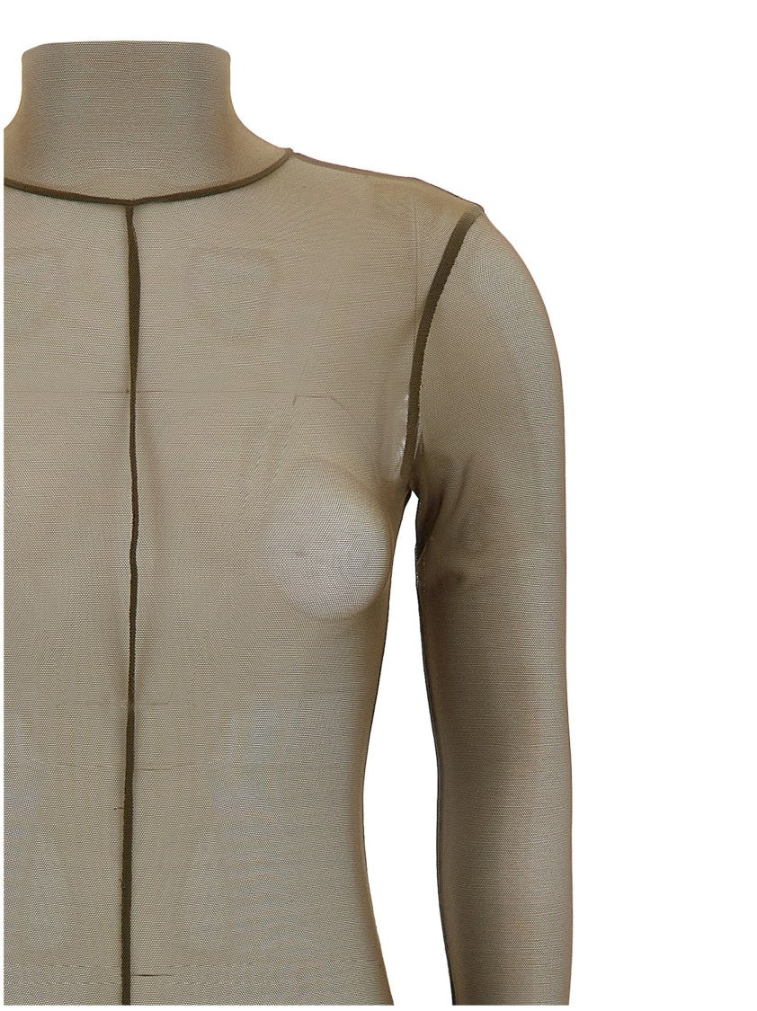 Crafted by Norma Kamali, this slim fit jumpsuit showcases a high neck and long sleeves, made from luxurious semi-transparent fabric. The back zip closure and raw cut hems contribute to a minimalist aesthetic, while vertical seam detailing enhances the sleek silhouette. This piece is designed for layering under the mermaid dress, embodying modern sophistication.