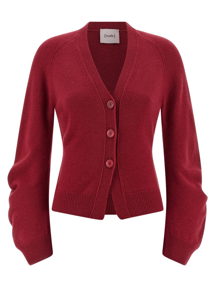 Experience the comfort of a red virgin wool cardigan by Nude, designed with an elegant V-neckline and a front button closure. Long cuffed sleeves add to its sophisticated charm, while ribbed trims at the cuffs and hem create a fitted silhouette, ideal for elevated casual occasions.