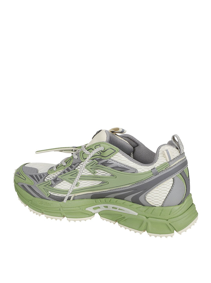 Off-White presents layered sneakers that showcase a dynamic blend of mesh and synthetic overlays. The chunky sole features intricate textures, while the upper is crafted in harmonious tones of light green, grey, and off-white. Patterned laces enhance the sporty aesthetic, making these shoes a statement piece for the modern man.