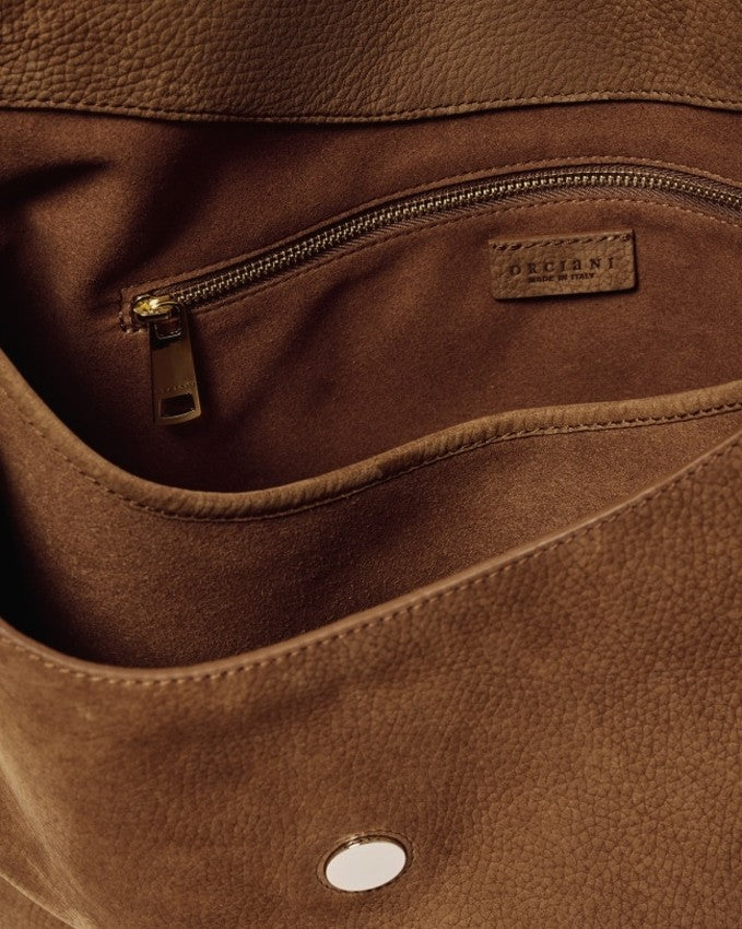 The Orciani Sella handbag embodies modern elegance, crafted from premium, soft hammered nubuck leather. This structured silhouette offers exceptional practicality with two spacious compartments and three interior pockets, including a zippered one for secure storage. The chic chain handle and adjustable shoulder strap provide versatility while the magnetic closure ensures your belongings are securely in place. An ideal accessory for those seeking refined style in everyday moments.
