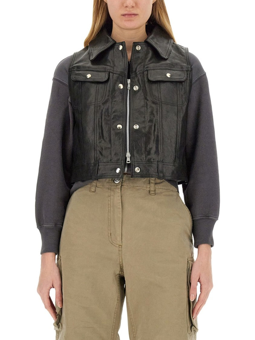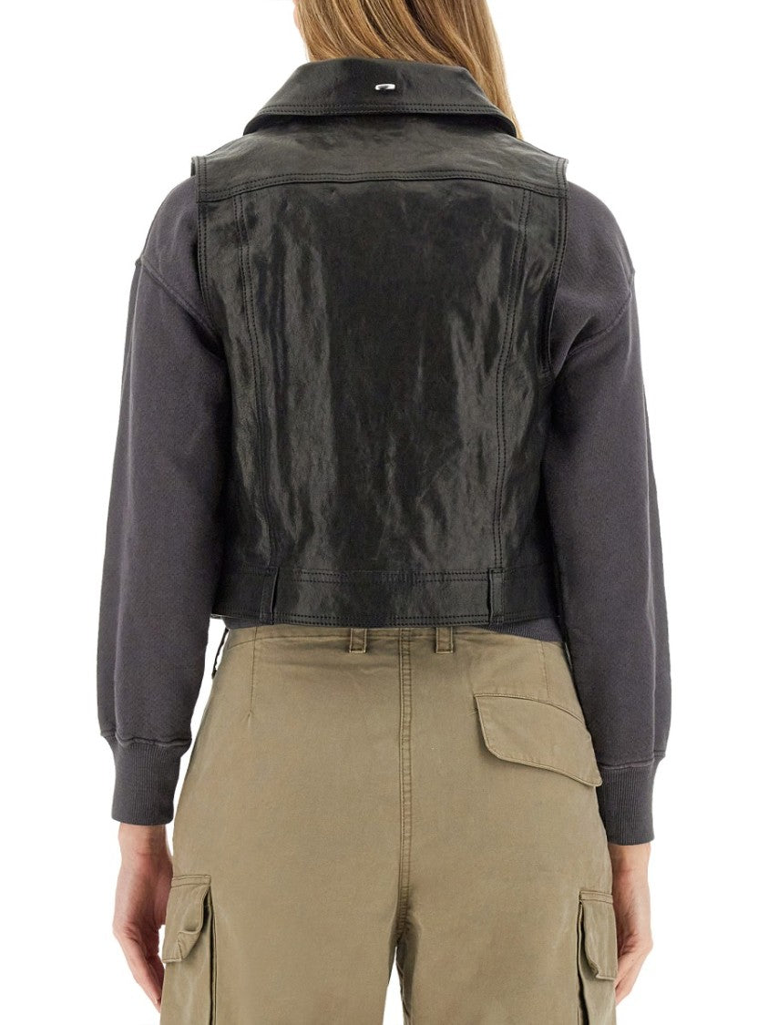 Our Legacy presents a cropped vest expertly crafted from 100% goat leather, embodying a unique blend of sporty casual aesthetics and refined craftsmanship. The structured silhouette features a button-up front, two chest pockets, a high collar, and a fitted waist, making it a versatile addition to any wardrobe.