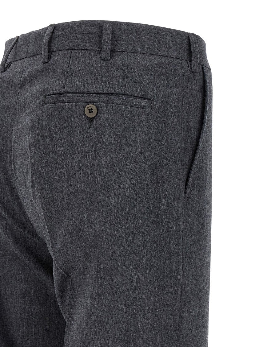 Pal Zileri presents the 'Linea Cerimonia' suit set, a hallmark of refined sophistication. This ensemble features a tailored single-breasted blazer adorned with mirror lapels and a removable metal brooch, complemented by a V-neck vest and elongated trousers. Each piece is meticulously crafted from stretch wool, ensuring a flattering fit and luxurious feel. Perfect for formal occasions, this suit embodies modern elegance with traditional craftsmanship.