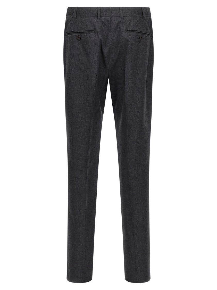 Pal Zileri presents a refined wool dress combining a single-breasted blazer and tailored trousers. The blazer features mirror lapels with a detachable metal brooch, flap pockets, and practical cuffs with buttonholes. Its sophisticated silhouette is complemented by back slits for movement. The matching trousers showcase stretched pleats and multiple pockets, all lined for comfort. Perfect for formal occasions, this ensemble exudes a timeless appeal.