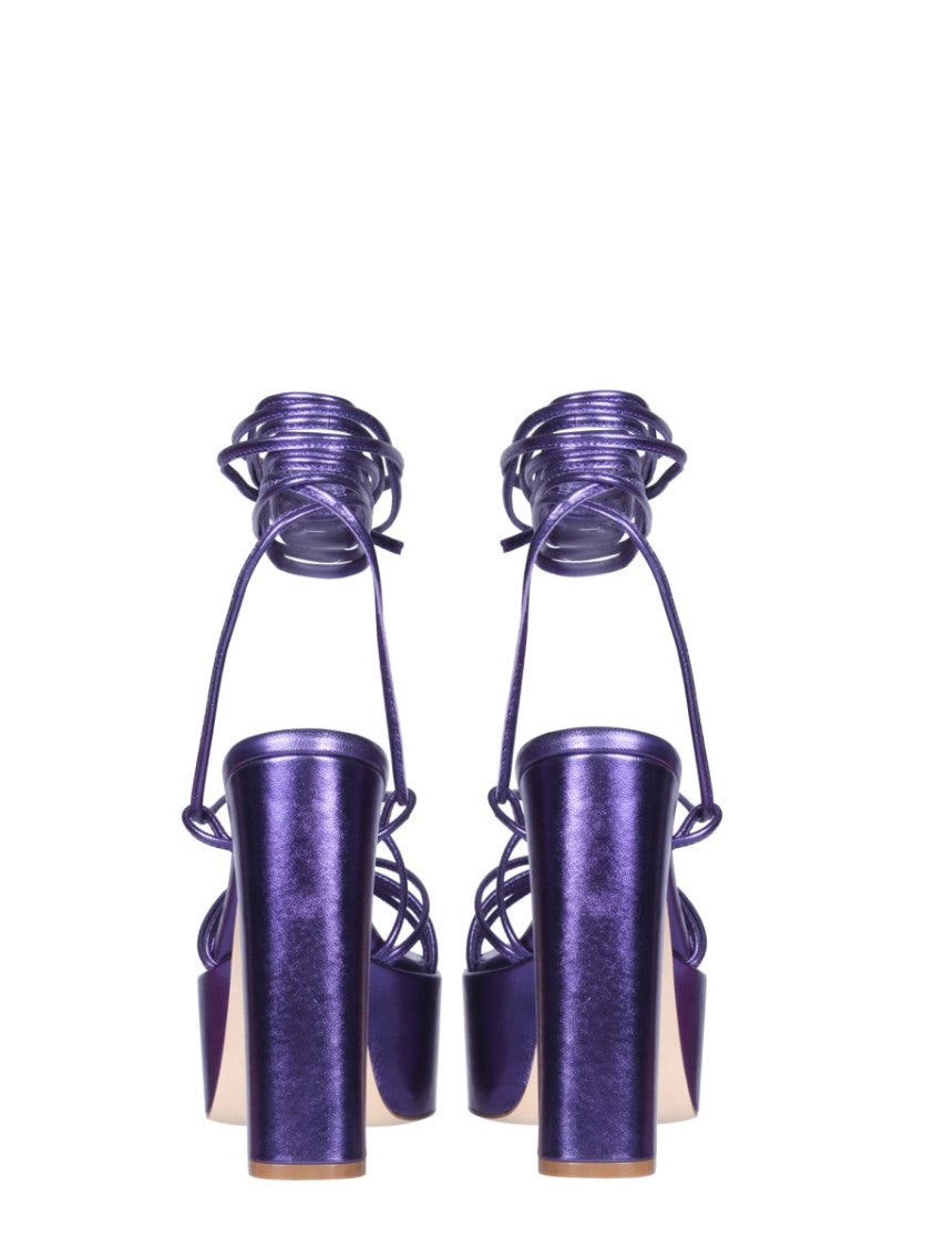 Elevate your footwear collection with the Malena Sandalwood by Paris Texas. Designed with a striking 13 cm block heel, these platform sandals feature multiple delicate straps that elegantly wrap around the ankle, offering both support and style. Crafted from luxurious metallic leather, the sandals boast a shiny, reflective surface in a bold deep purple hue, making them the perfect statement piece for any sophisticated outfit.