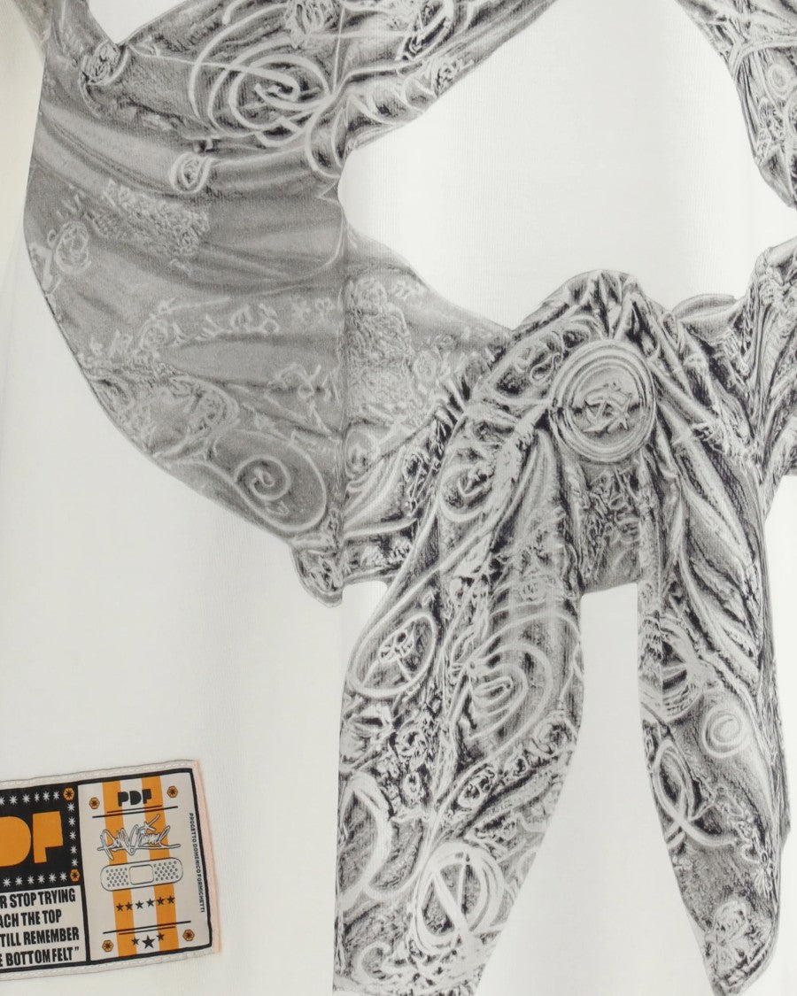 This oversized crew neck t-shirt by PDF merges contemporary art with casualwear, showcasing modern style. The graphic print on the front adds sophistication against a light white backdrop with grey accents. Made from 100% cotton, it offers a soft and breathable feel, ideal for relaxed outings or artistic moments.