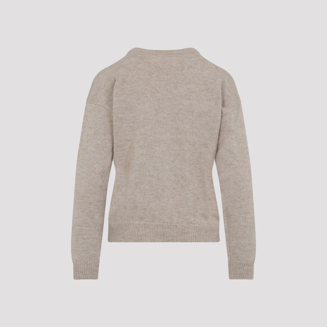 Amber Beige Virgin Wool Knit Sweater made from a luxurious blend of virgin wool, silk, and cashmere. The design includes a round ribbed neckline, long sleeves with ribbed cuffs, and a straight hem. A diamond pattern is intricately embellished with sequined details, adding a touch of sophistication.
