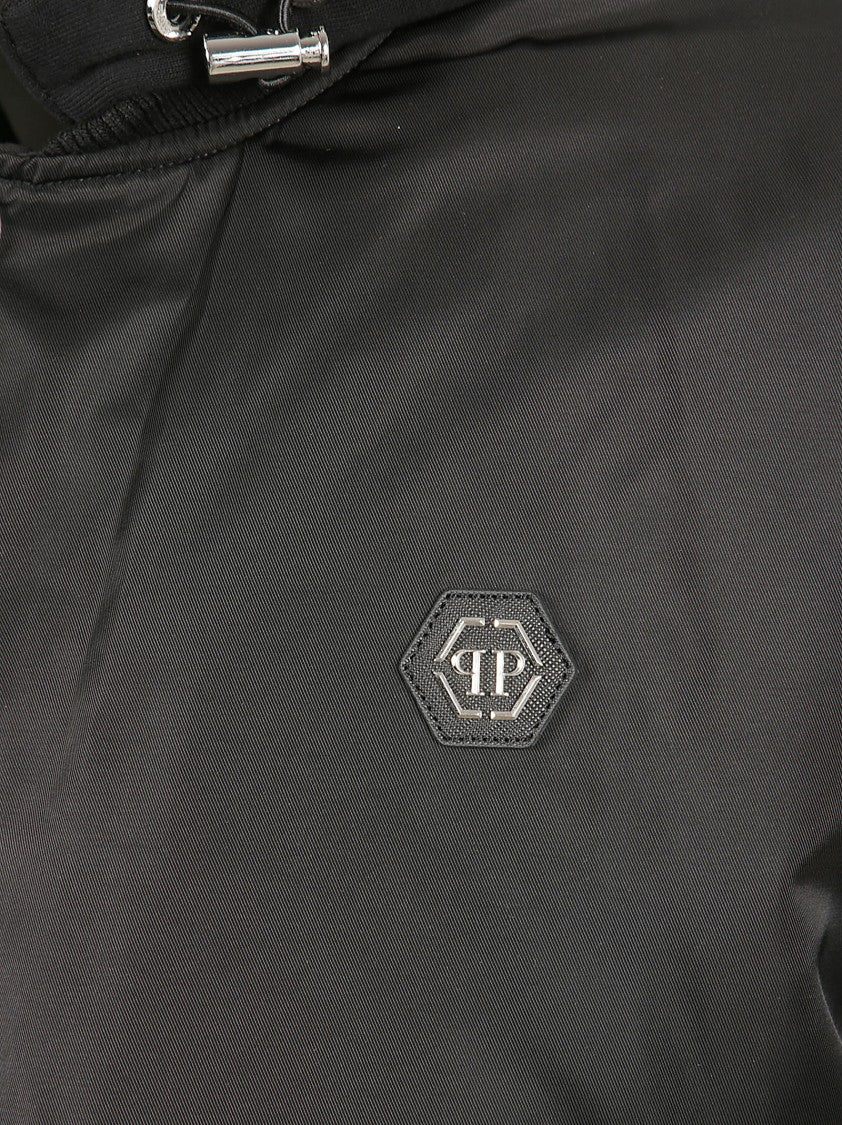 Philipp Plein presents a masterfully designed coat that artfully combines nylon and deer-print leather for a striking visual contrast. The cotton fleece hood enhances comfort and warmth, while the logoed patch on the left chest adds a distinctive touch. Featuring practical press studs, two functional slit pockets, and rib knit hems, this piece ensures both style and utility. The luxurious diamond quilted satin lining further elevates the coat's quality and texture, offering an elevated experience for the discerning wearer.
