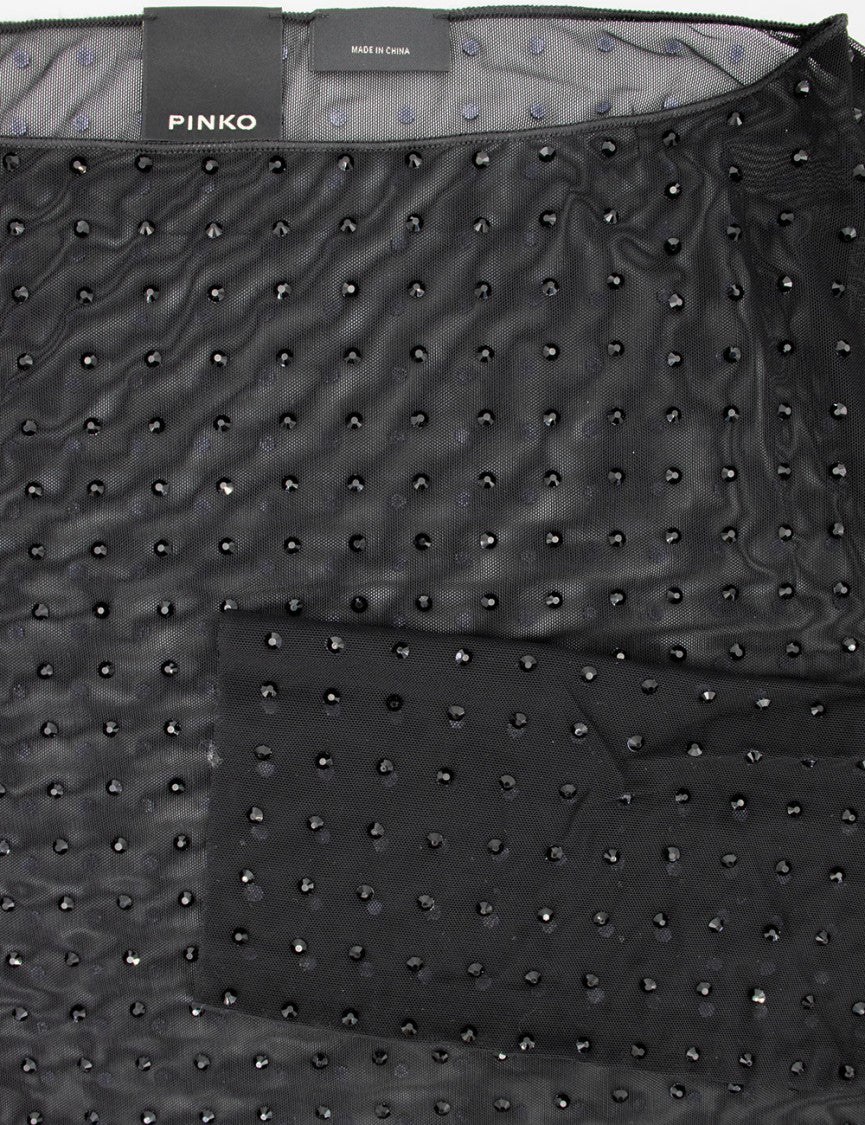 Make a bold statement in the Black Limousine Transparent Shirt by PINKO. This fitted piece showcases a chic boat neckline and features a delicate lace overlay with glittery accents, elegantly complementing the sheer fabric. The long sleeves and structured silhouette create an aura of sophistication while adding a daring touch to any ensemble.