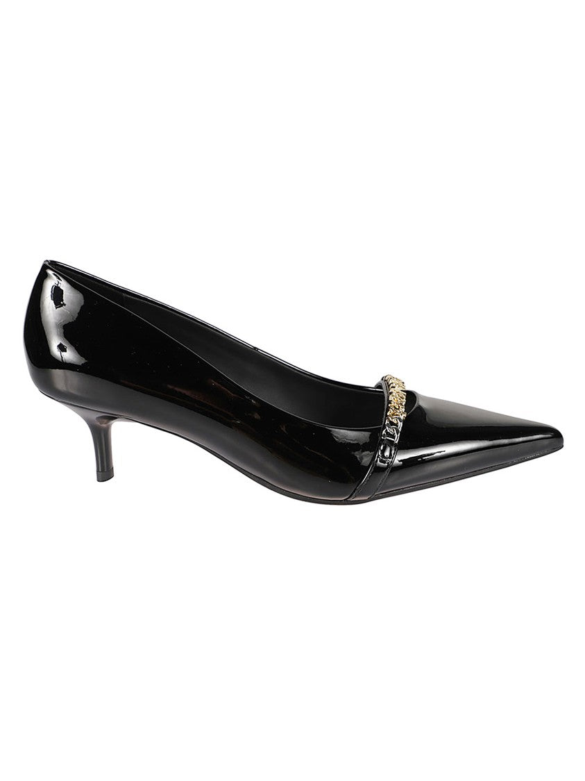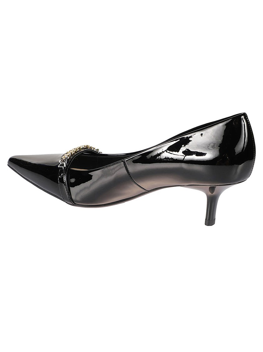 These leather decolletè shoes by Pinko showcase a classic design that combines sophistication and style. The pointed toe and modest heel contribute to their elegant silhouette, while the glossy black finish adds a touch of luxury. A striking decorative chain detail elevates the overall look, making them ideal for formal events.