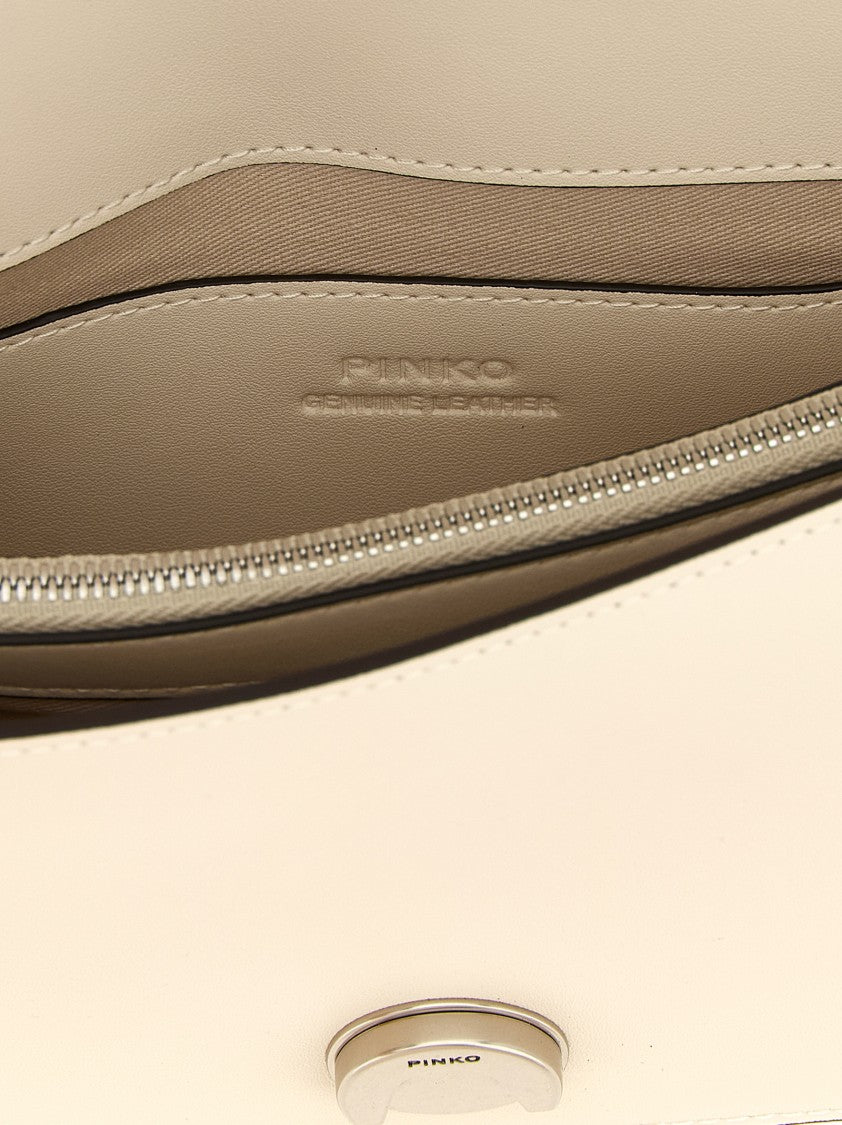 The Pinko 'Love One Mini' crossbody bag presents a structured design made from 100% calfskin leather, radiating elegance. An interlocking flap closure highlights a bold metal logo appliqué, and the chain shoulder strap includes removable leather protection for added comfort. Its roomy interior accommodates essentials, making it suitable for various occasions.