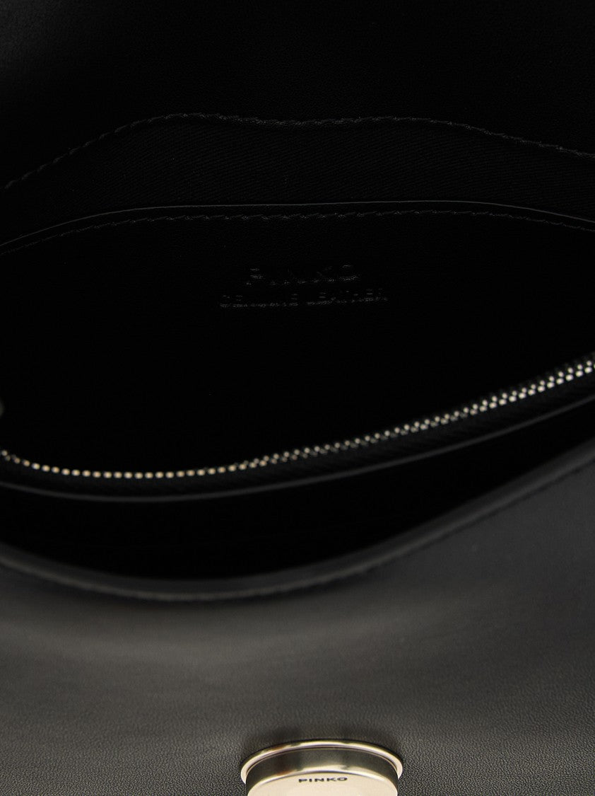The 'Love One Mini' crossbody bag by Pinko showcases exquisite craftsmanship. Made from 100% calfskin leather, it includes an interlocking flap closure with a striking metal logo appliqué. The chain shoulder strap, featuring a removable leather protector, blends style and practicality, making it an ideal accessory for discerning individuals.