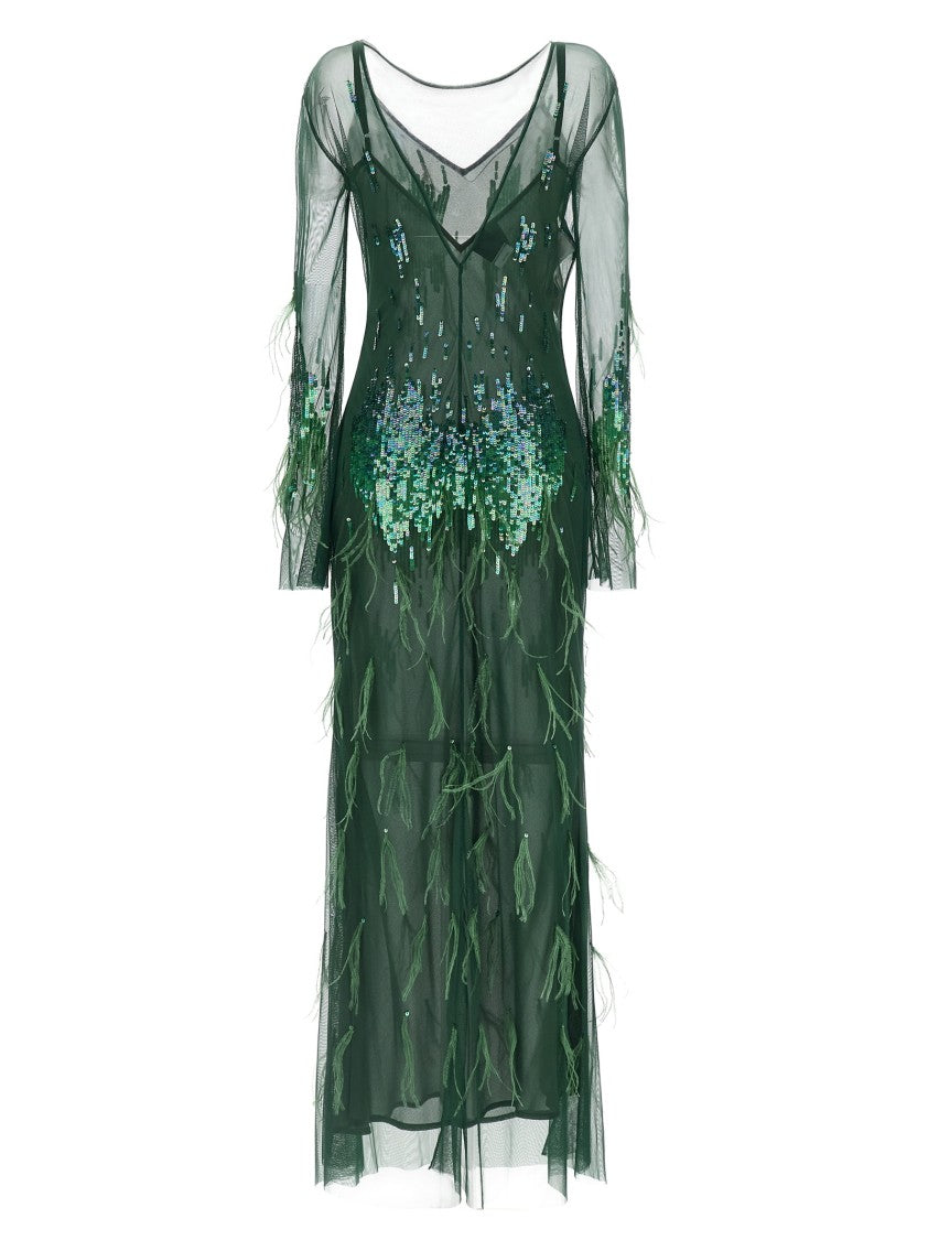 This captivating long tulle dress by Pinko showcases an exquisite deep V-neck and long sleeves, accentuated by raw cut hems. Featuring hand-embroidered dégradé sequin appliqué and luxurious feather inserts, the dress radiates a shimmering allure. The design is complemented by a petticoat with thin adjustable straps and a removable V-neck layer, ensuring a perfect fit that is true to size, ideal for elevating any special occasion.