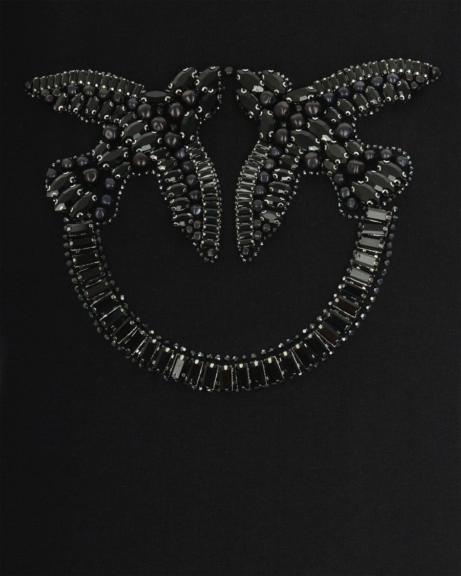 Pinko introduces the T-shirt Quentin, a classic piece made from high-quality black jersey cotton. The front showcases beautiful Love Birds embroidery, embellished with beads and crystals, adding a touch of luxury to its elegant design. This T-shirt is an ideal choice for a sophisticated wardrobe.