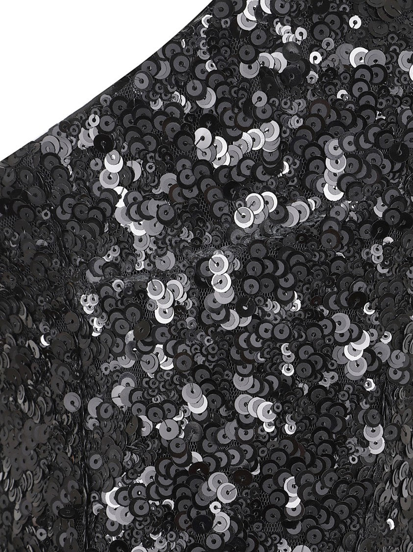 A captivating floor-length dress by Pinko showcases shimmering black sequins for a striking visual impact. The straight silhouette includes a subtle back slit for mobility and a structured panel for support and style, making it a great choice for glamorous evening events.