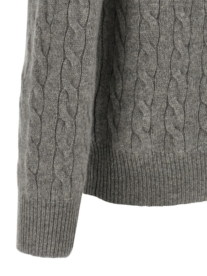 This long-sleeved polo shirt from Polo Ralph Lauren showcases a luxurious blend of wool and cashmere, featuring a distinctive braided cable knit pattern. The classic collar is accompanied by buttons and ribbed cuffs, while the front includes a subtle embroidered logo, epitomizing modern sophistication.