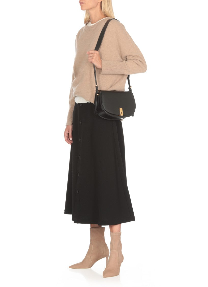 Polo Ralph Lauren introduces a sophisticated Mini Saddle Bag made from smooth black leather. The bag features a main flap compartment with a unique metal slot fastening that showcases the iconic logo. An adjustable shoulder strap provides comfort, and the interior is designed with four pockets for efficient organization. This bag seamlessly combines casual elegance, making it suitable for both day and evening events.