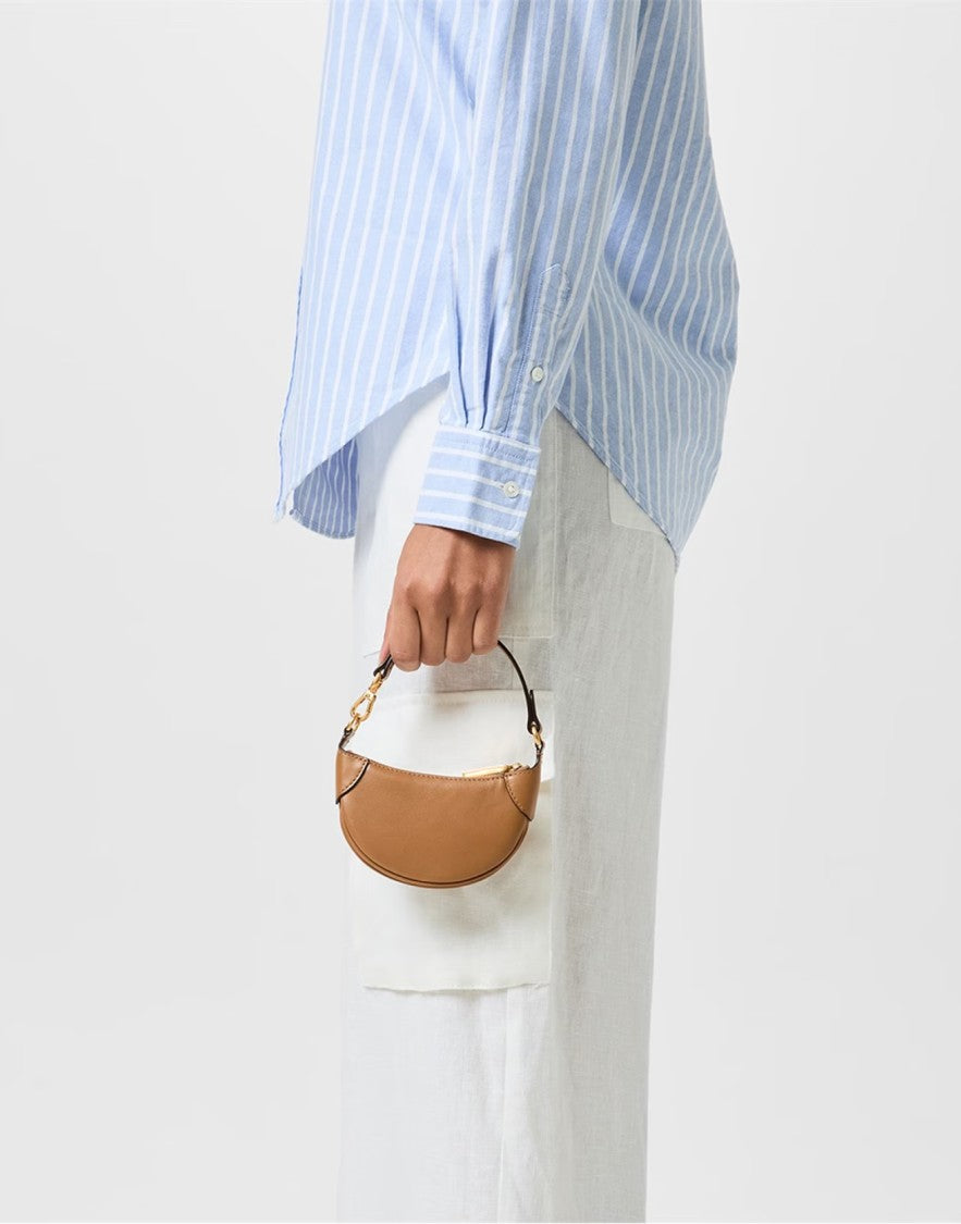 This compact Polo Ralph Lauren ID Card Case Bag showcases a sleek, curved silhouette crafted from premium tan leather. It features a top zipper closure and a short handle for effortless carrying. The subtle logo adds an exquisite touch, making it an ideal accessory for your essentials.