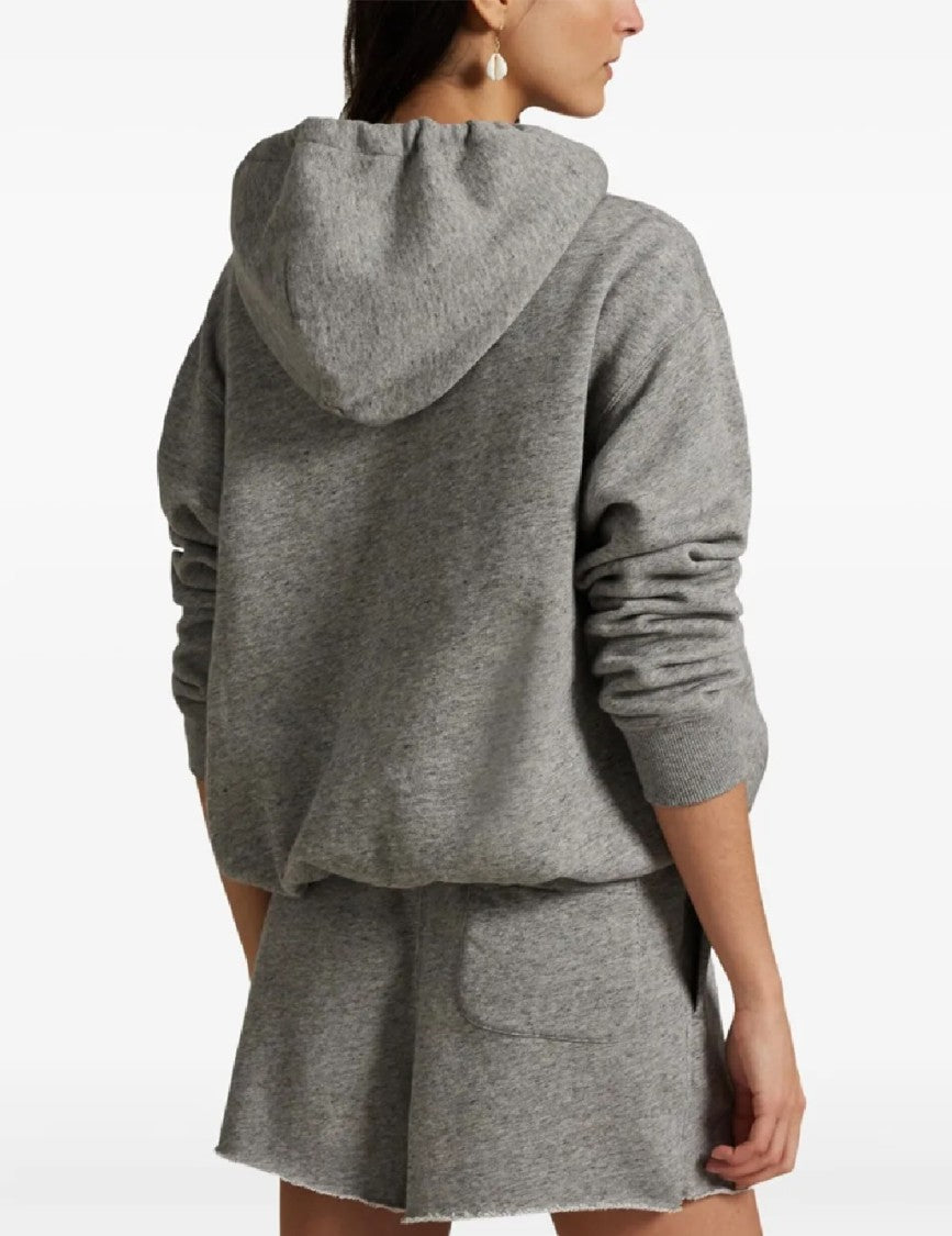 Polo Ralph Lauren introduces a relaxed fit knit sweatshirt made from a soft cotton-poly blend, providing comfort and durability. The design includes a drawstring hood and ribbed cuffs for a cozy fit, highlighted by a playful bear graphic in sporty attire. Perfect for casual outings or relaxing at home.