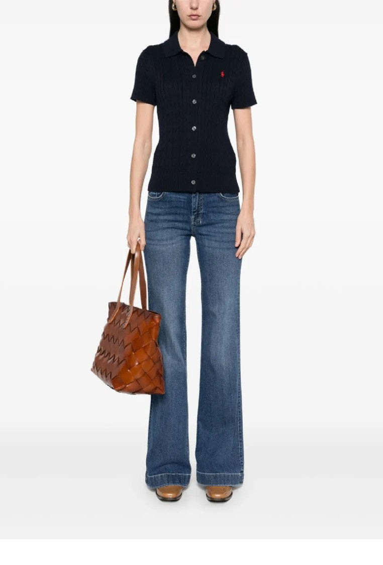 A textured cable knit short sleeve cardigan by Polo Ralph Lauren serves as a quintessential layering piece that combines comfort and style. The fitted silhouette enhances the waist, complemented by a classic collar and button-down front for timeless appeal. Crafted from 100% cotton, this cardigan showcases modern versatility, making it ideal for both casual and classic outfits.