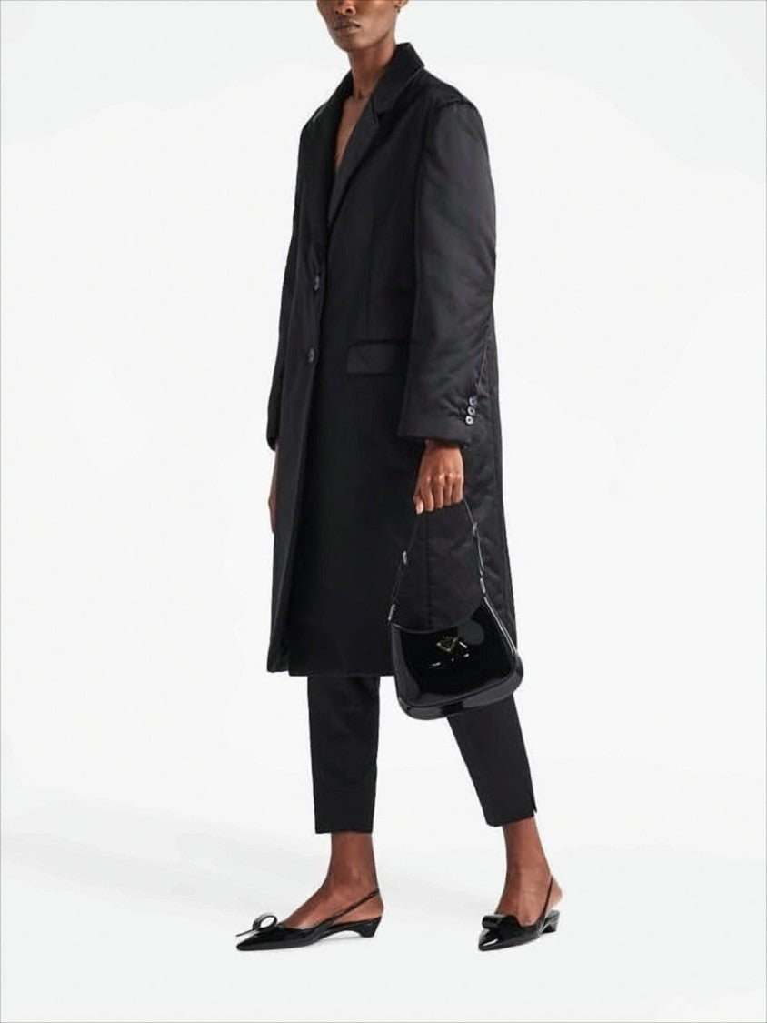 A sophisticated shoulder bag from Prada, meticulously crafted in Italy from luxurious patent leather. Featuring a smooth, curved silhouette, this design showcases a single adjustable strap adorned with exquisite gold-tone hardware and a distinctive triangular metal logo plaque at the front. It offers a magnetic closure and a minimalist interior, embodying elegance and practicality for everyday use.