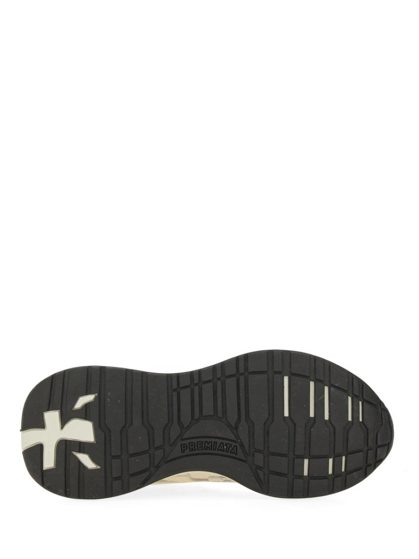These low-top sneakers from Premiata are made from smooth calf leather in a light beige shade. The design merges contemporary aesthetics with casual flair, showcasing subtle paneling and tonal laces that include delicate metallic charms. A slightly chunky sole with printed detailing and a black rubber outsole provides both style and traction for a confident stride.